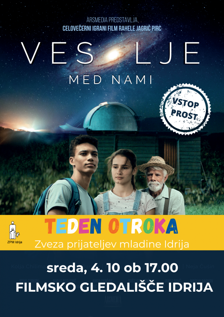 V Tednu otroka društva po Sloveniji organiziramo različne dogodke za otroke. ZPM Idrija v sredo, 4. oktobra ob 17. uri v Filmskem gledališču v Idriji, za otroke in mladostnike organizira brezplačen ogled slovenskega filma Vesolje med nama.