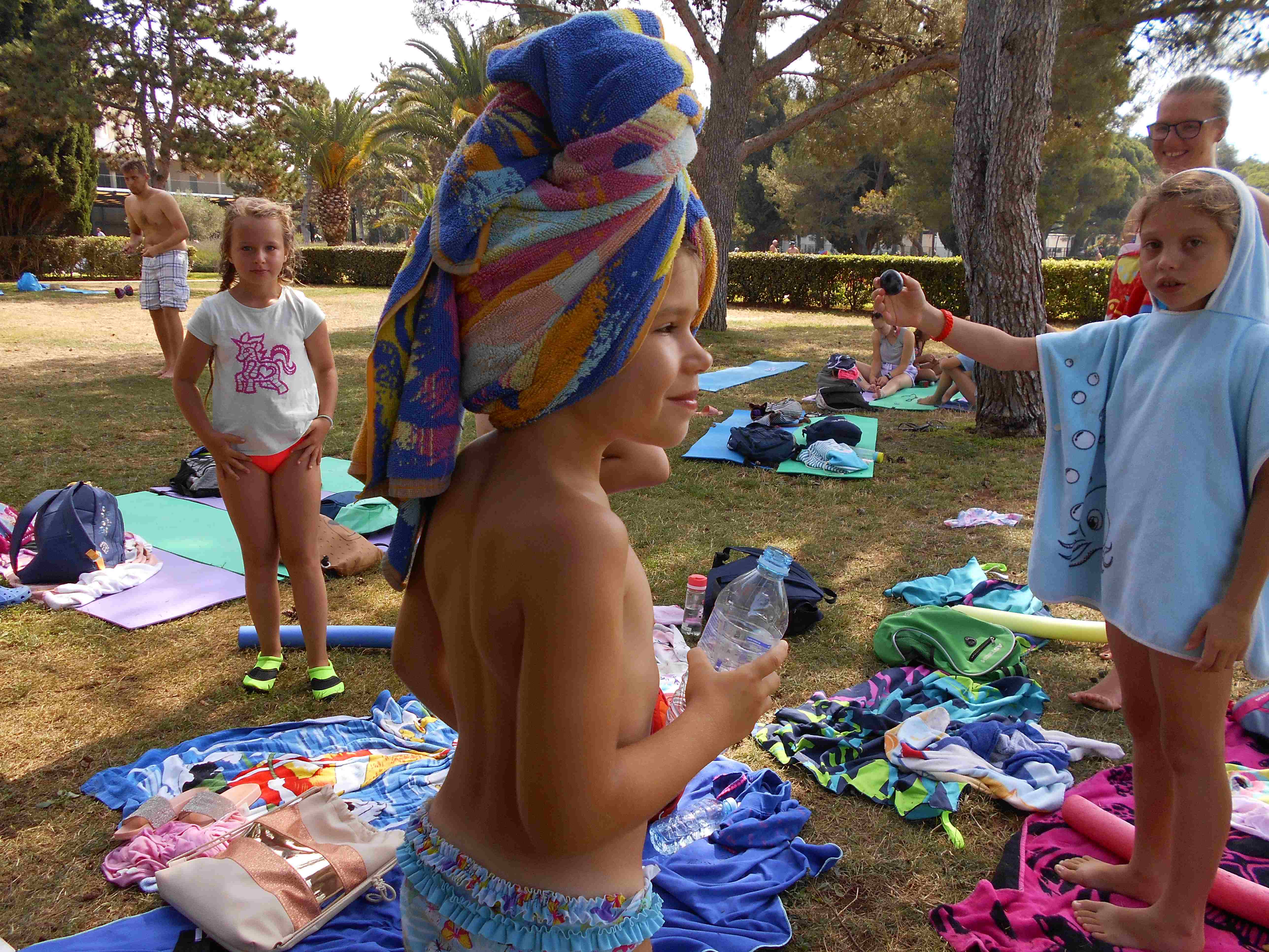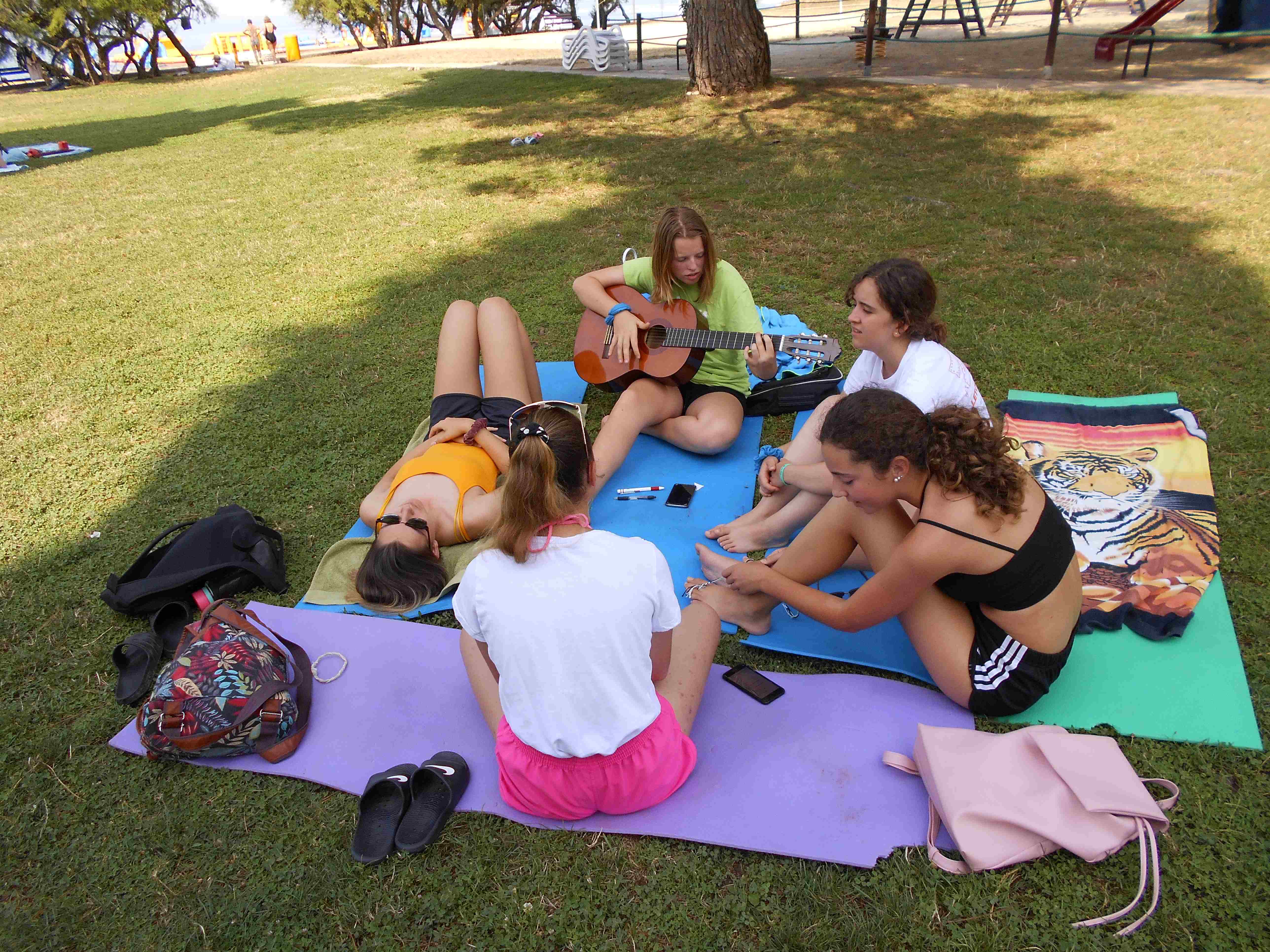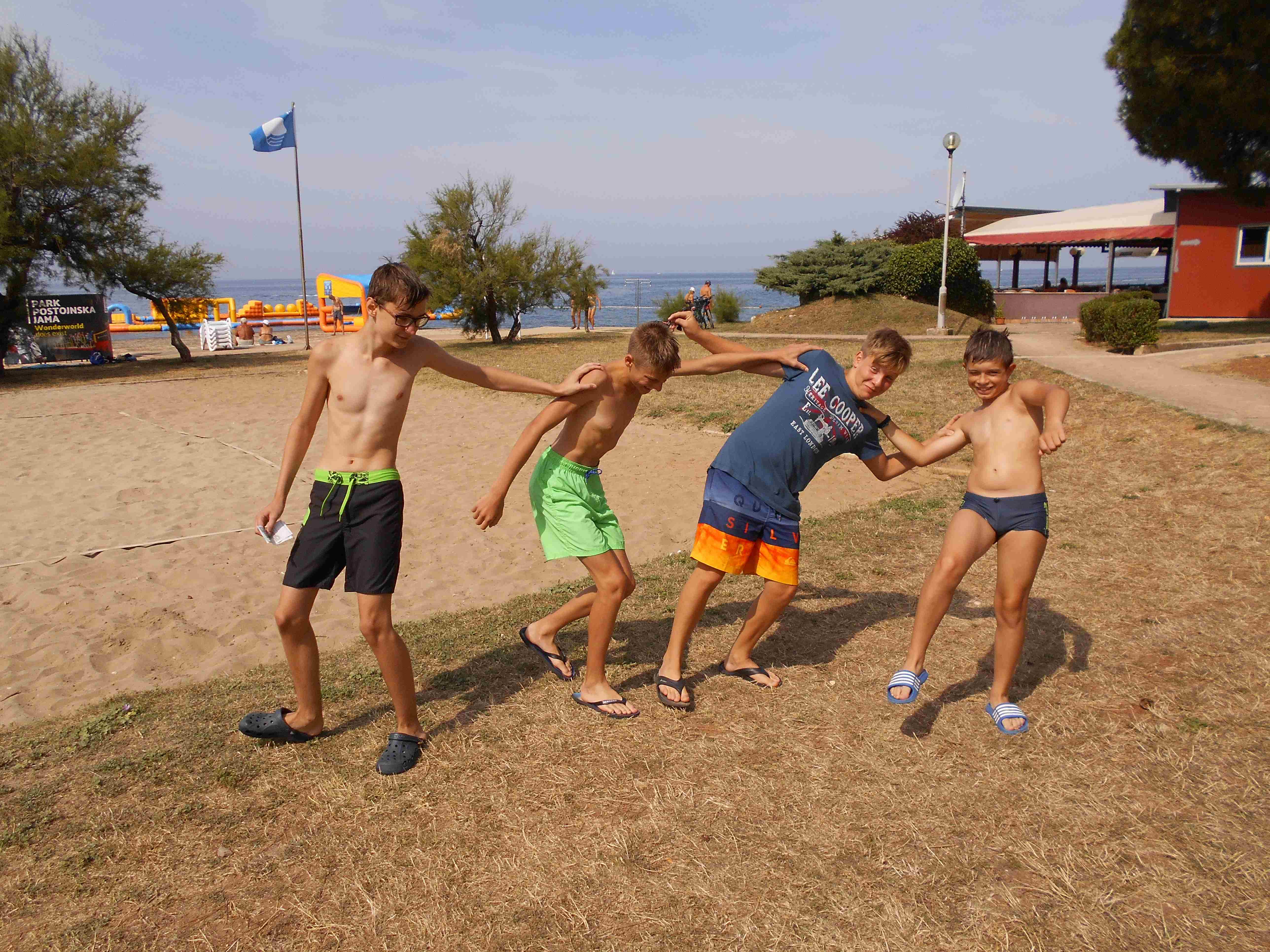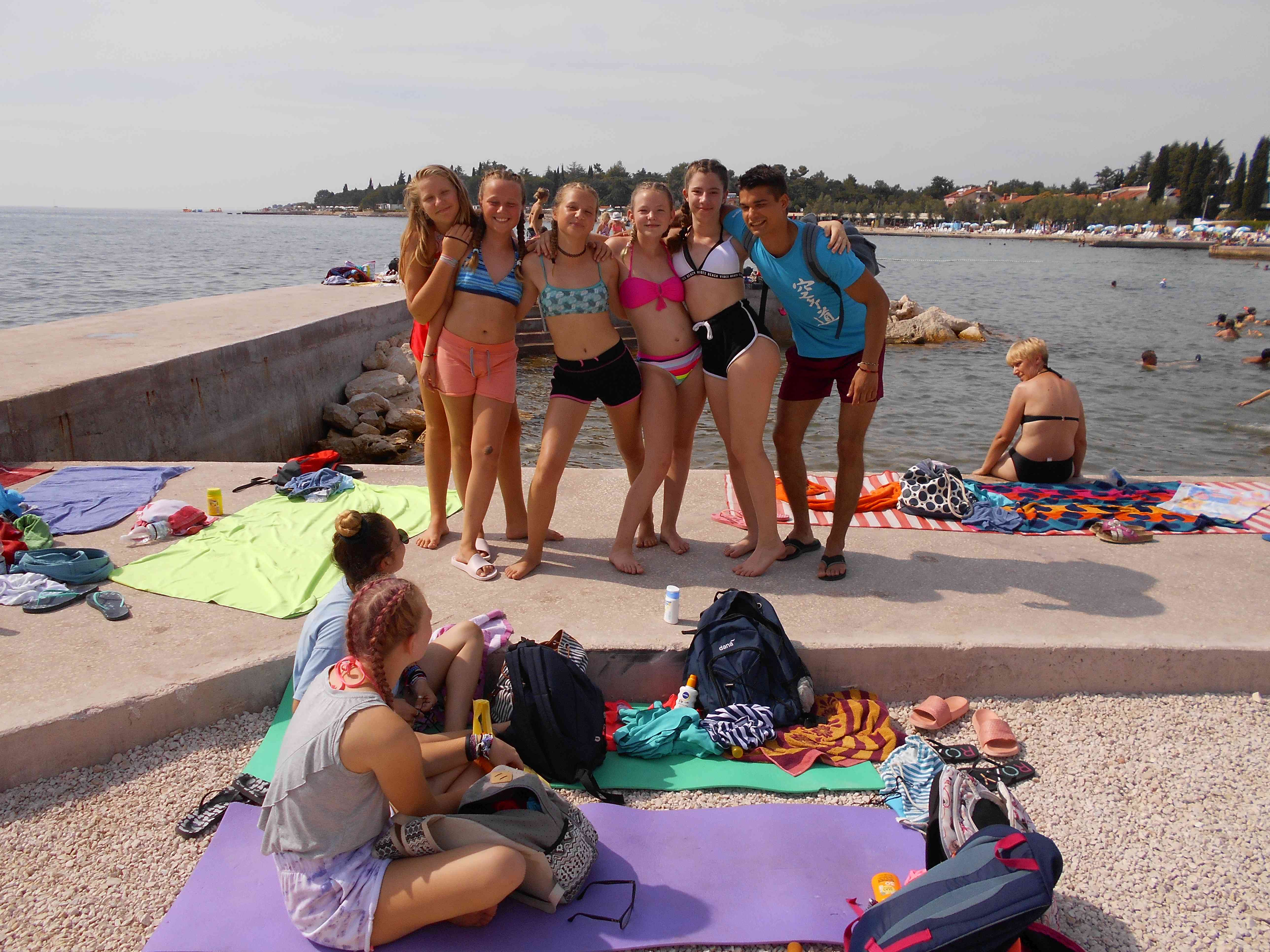 V ritmih ferari polke smo se zbudili v čudovito, toplo in sončno jutro. S pomočjo joge smo najprej pozdravili sonce, nato pozajtrkovali pospravili sobe in se odpravili na plažo. Na plaži smo lenobno poležavali, igrali različne igre, se zakopavali v mivko, pletli zapestnice in čofotali.