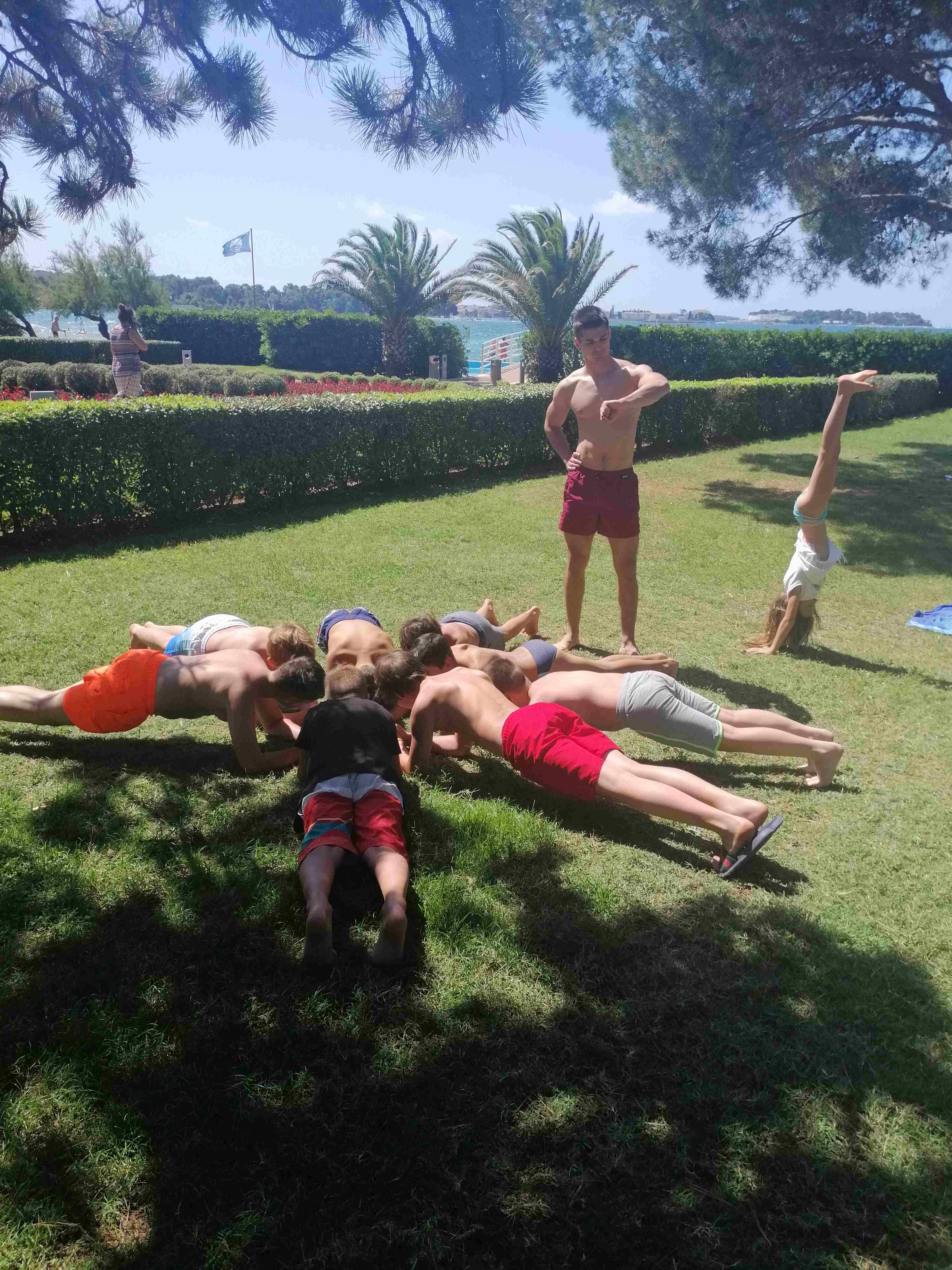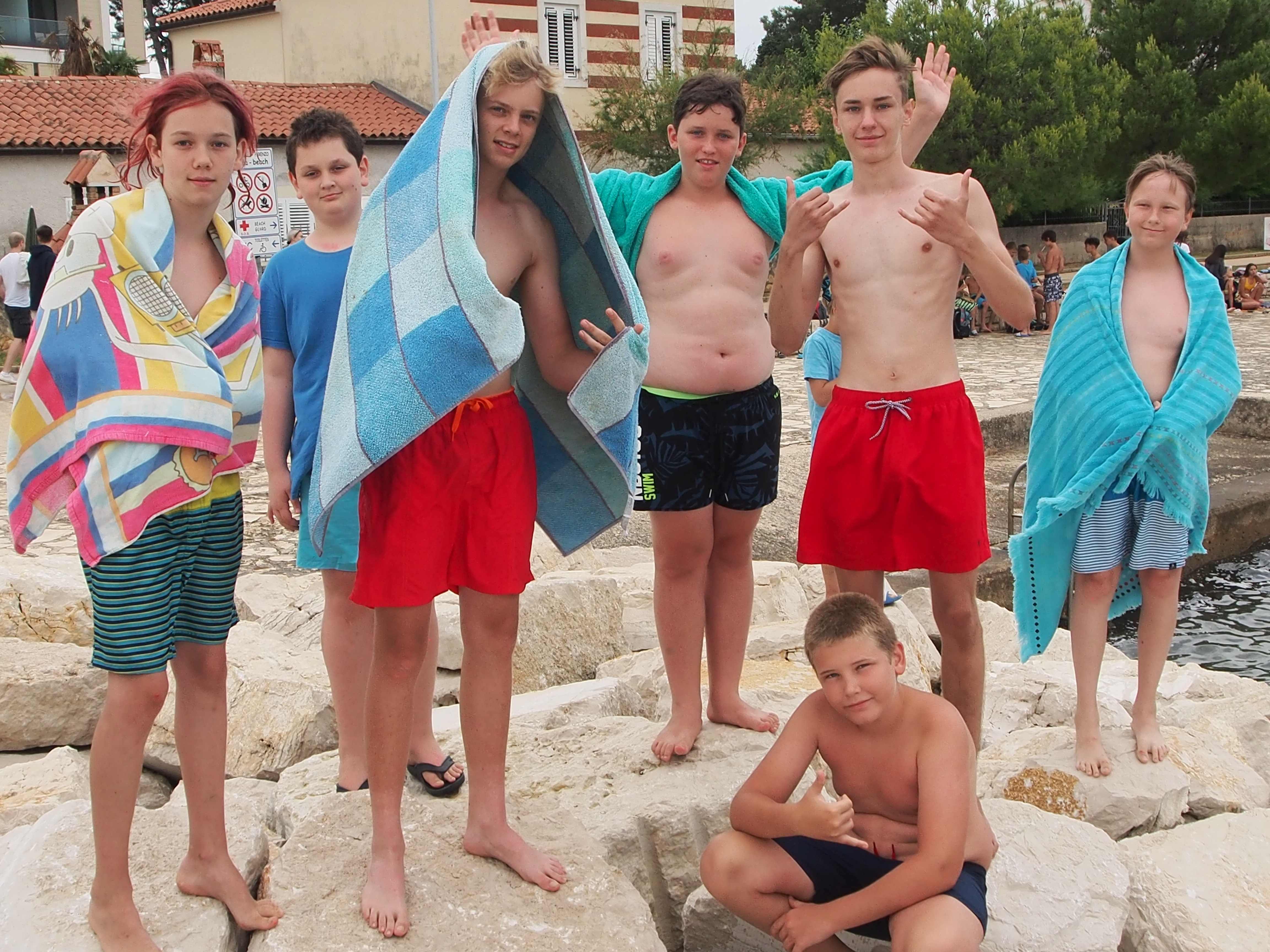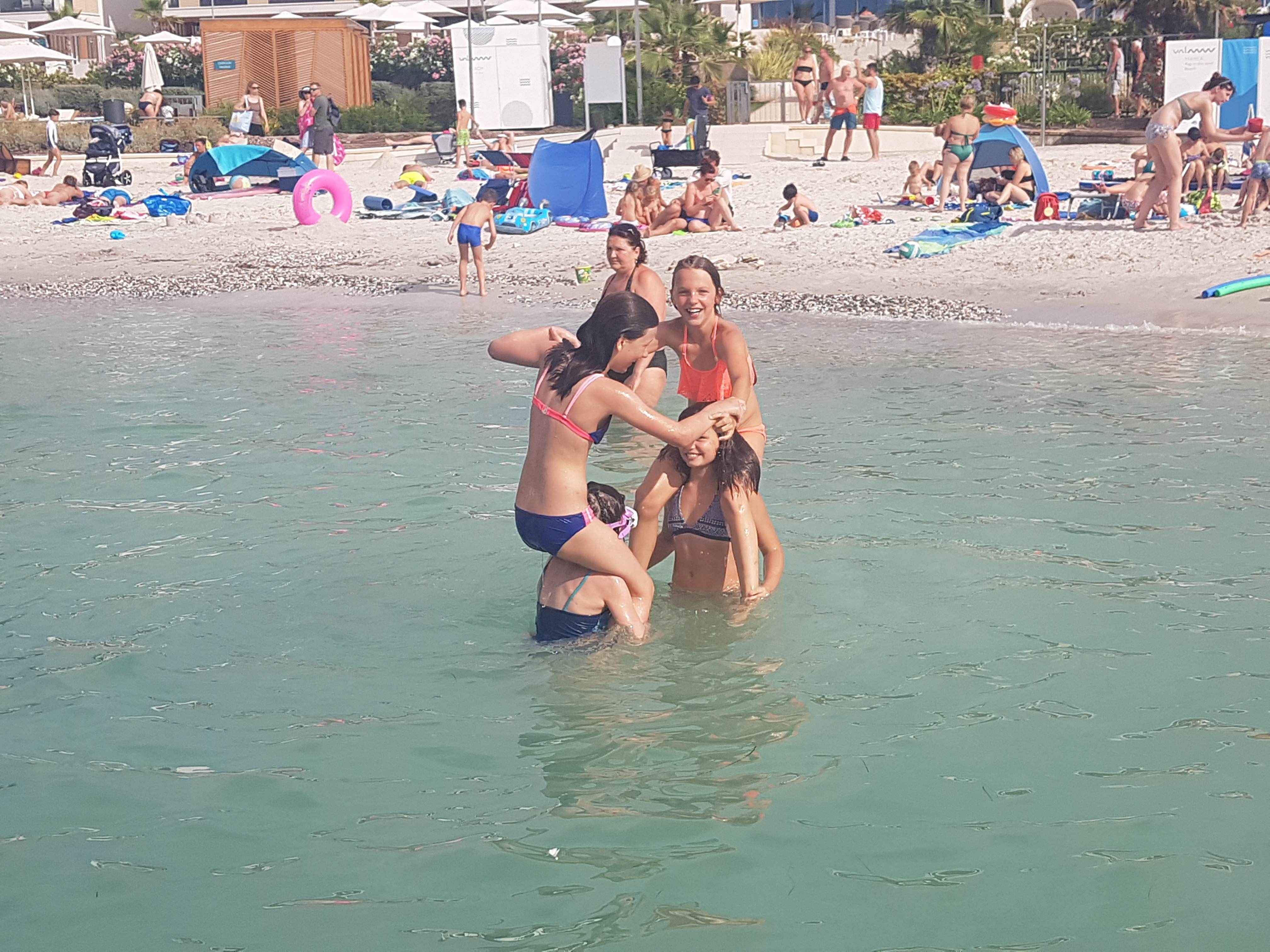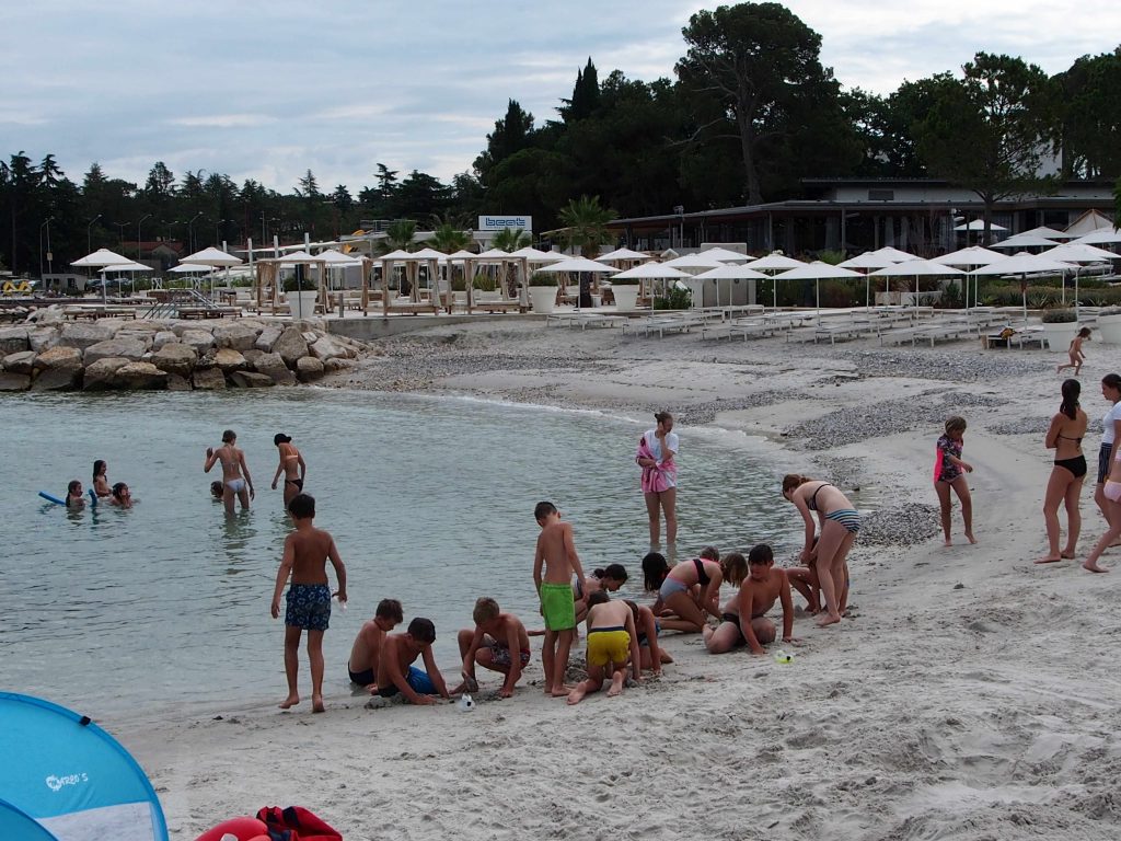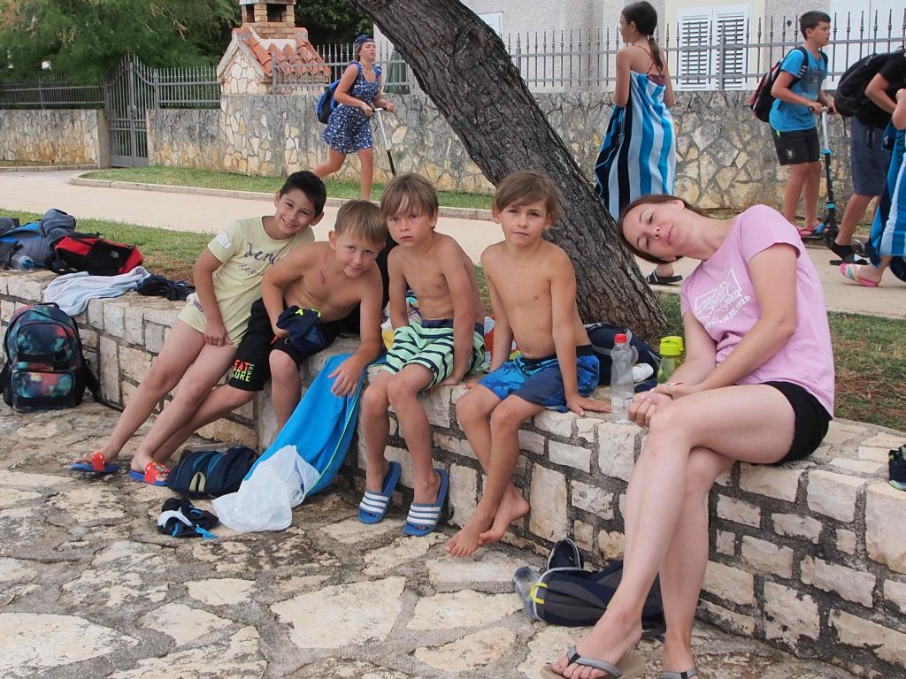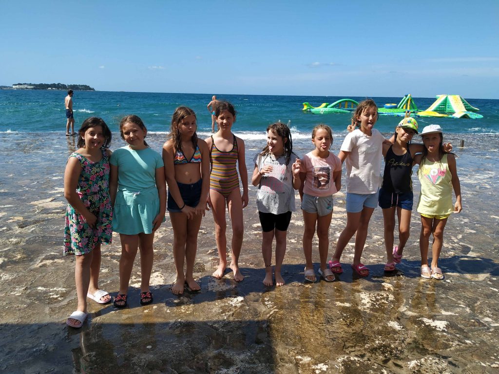 Kako dnevi hitro bežijo, saj smo že čez polovico našega letovanja. Kot običajno smo se zjutraj prebudili, se odpravili na telovadbo in po telovadbi na zajtrk. Sledilo je pospravljanje sob, ocenjevanje in odhod na plažo. Starejši otroci so ponovno veliko igrali odbojko, nekateri pa so se pod budnim očesom učitelja Erina preizkusili v »akrobatskih« spretnostih. Tisti najmlajši, ki jim še malo manjka, da postanejo čisto pravi plavalci so imeli plavalni tečaj, ostali pa so raziskovali morsko dno in čofotali po vodi.