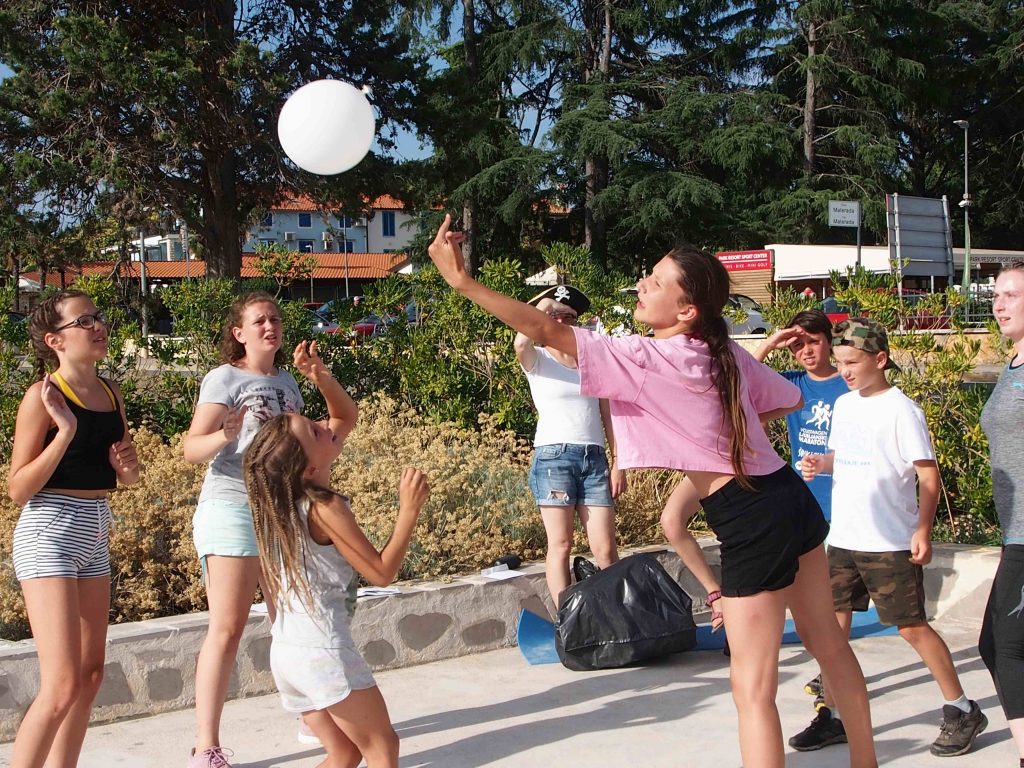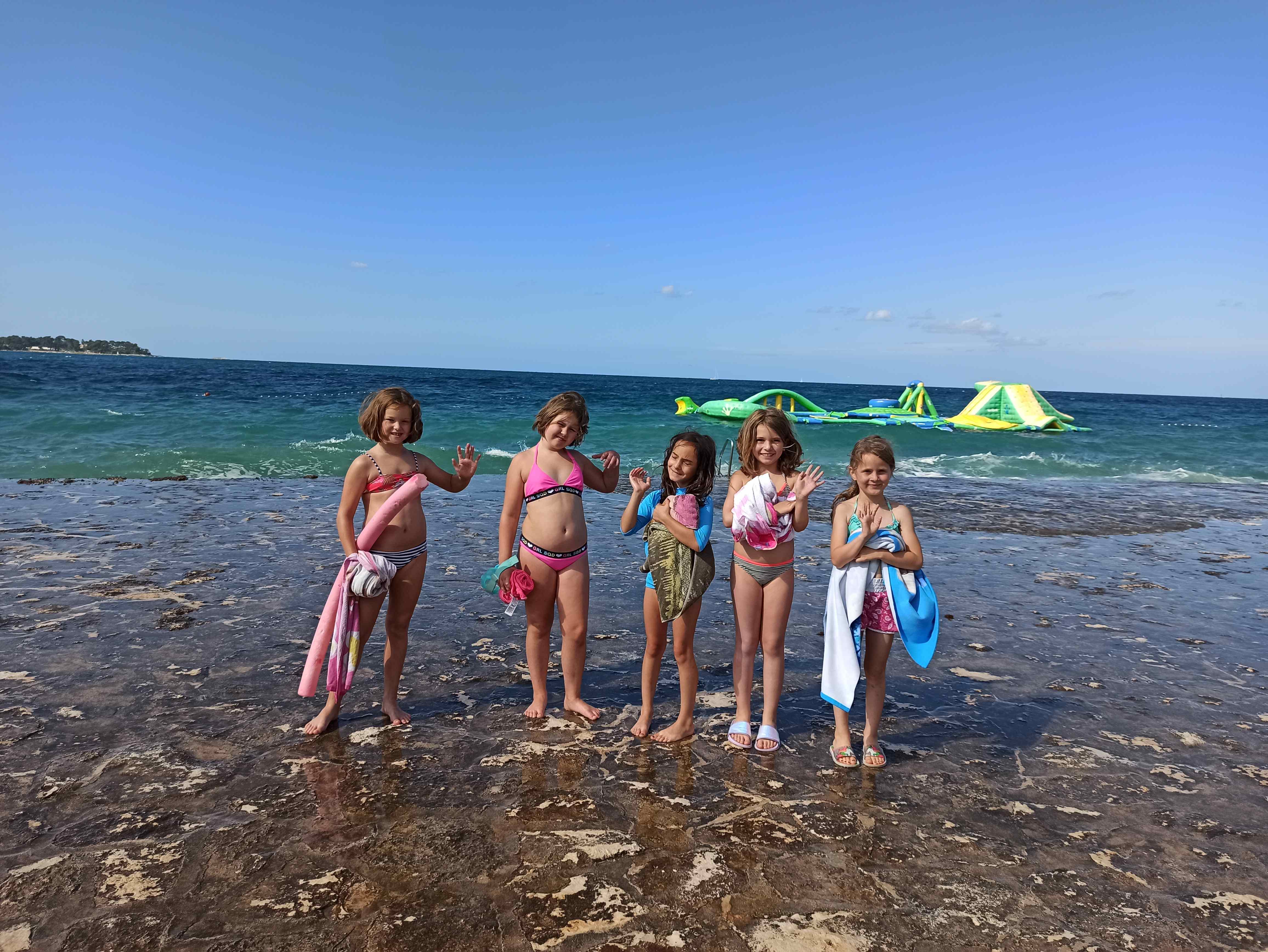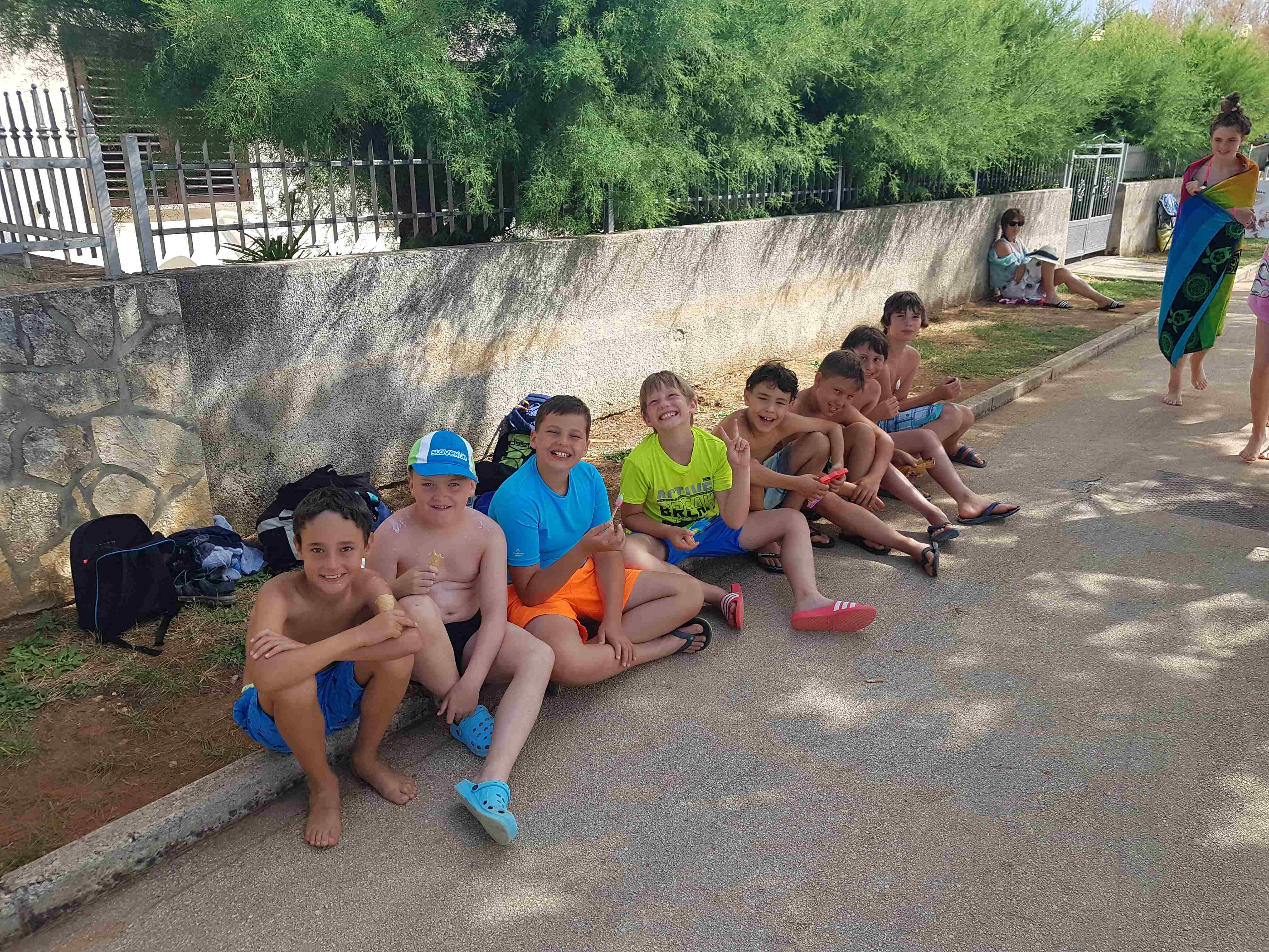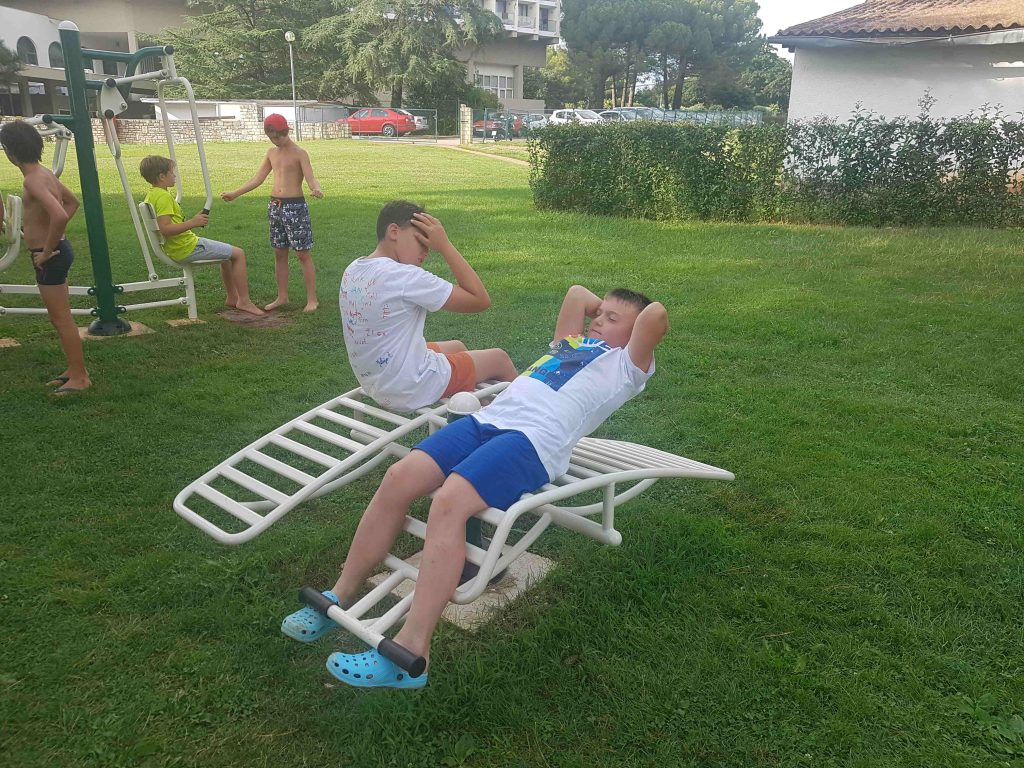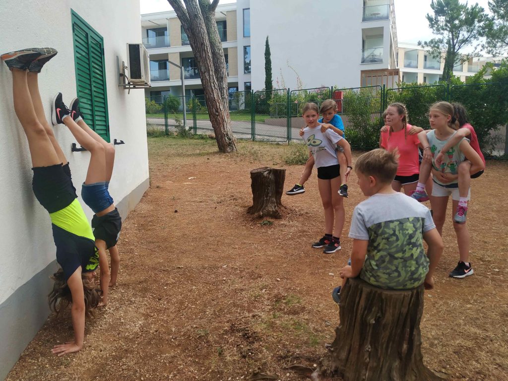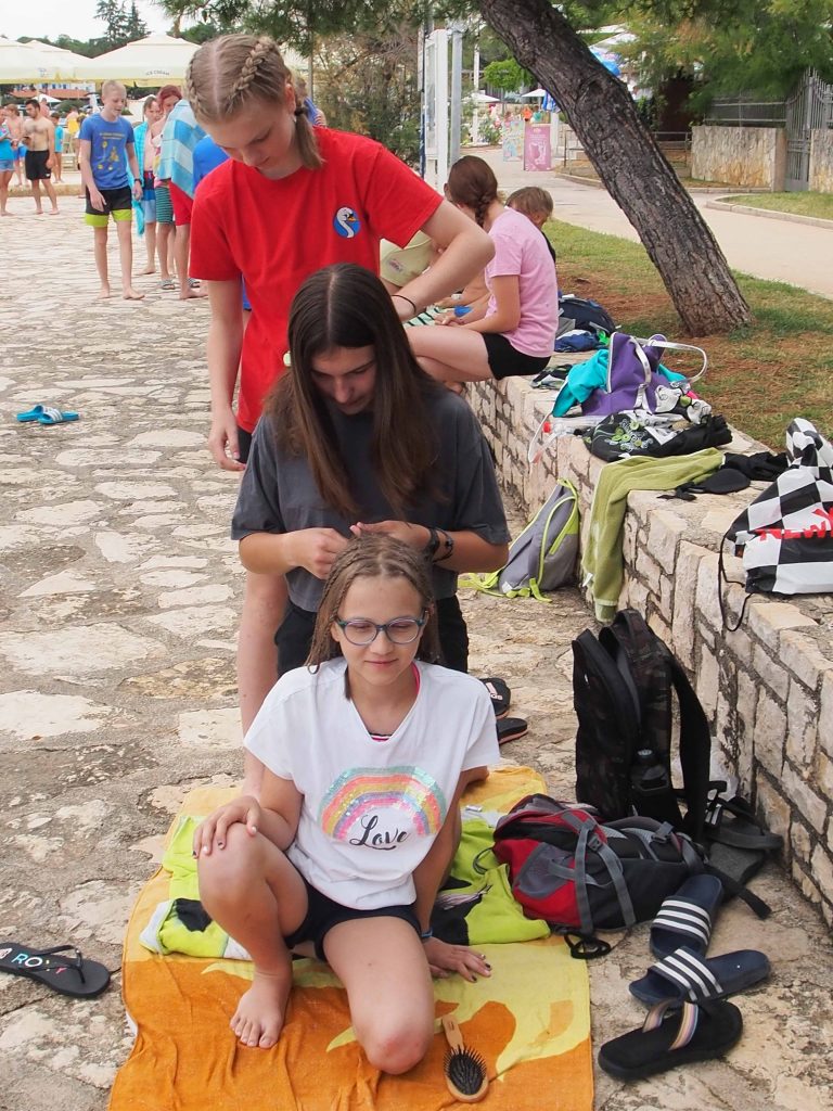 Kako dnevi hitro bežijo, saj smo že čez polovico našega letovanja. Kot običajno smo se zjutraj prebudili, se odpravili na telovadbo in po telovadbi na zajtrk. Sledilo je pospravljanje sob, ocenjevanje in odhod na plažo. Starejši otroci so ponovno veliko igrali odbojko, nekateri pa so se pod budnim očesom učitelja Erina preizkusili v »akrobatskih« spretnostih. Tisti najmlajši, ki jim še malo manjka, da postanejo čisto pravi plavalci so imeli plavalni tečaj, ostali pa so raziskovali morsko dno in čofotali po vodi.