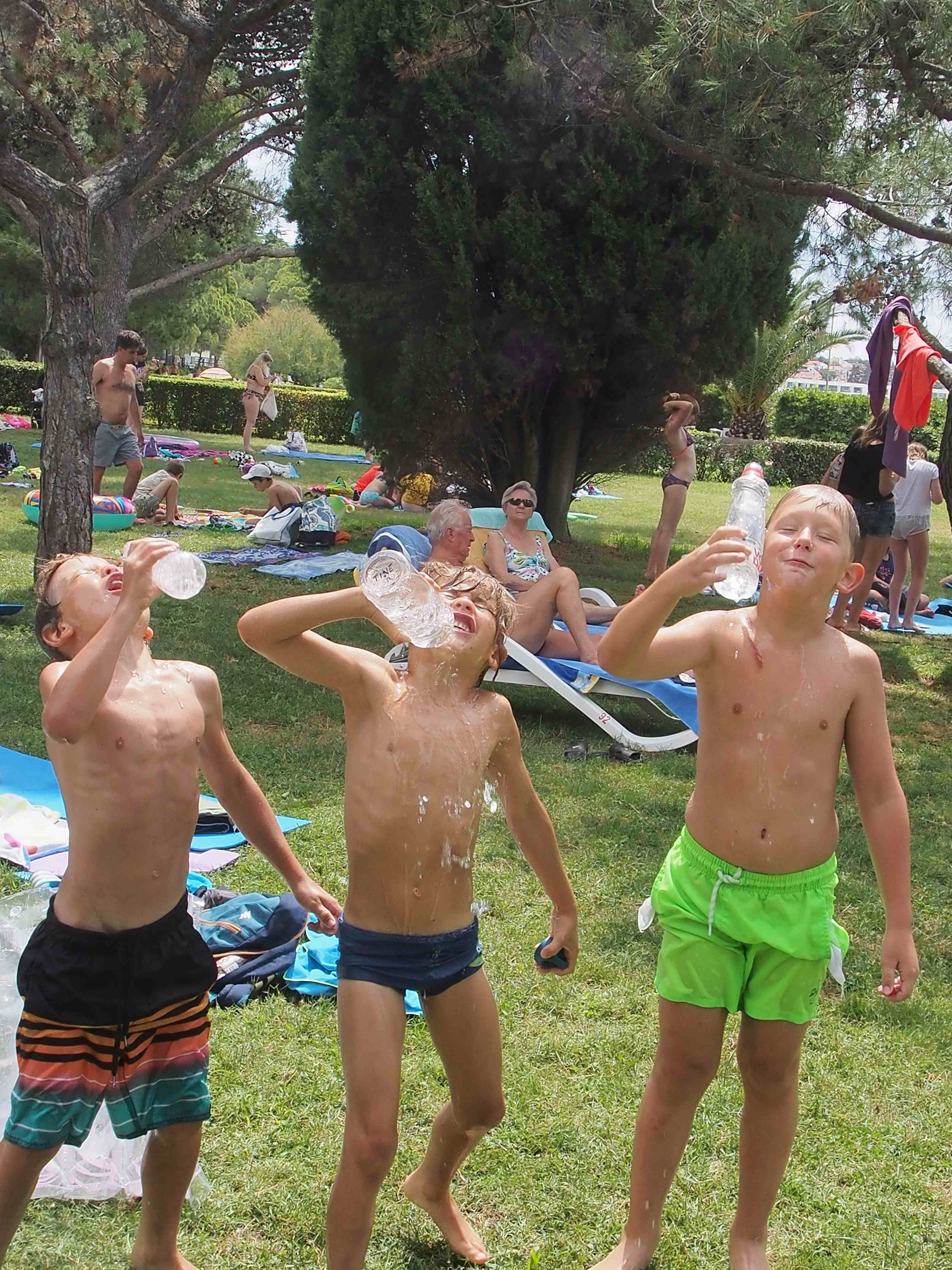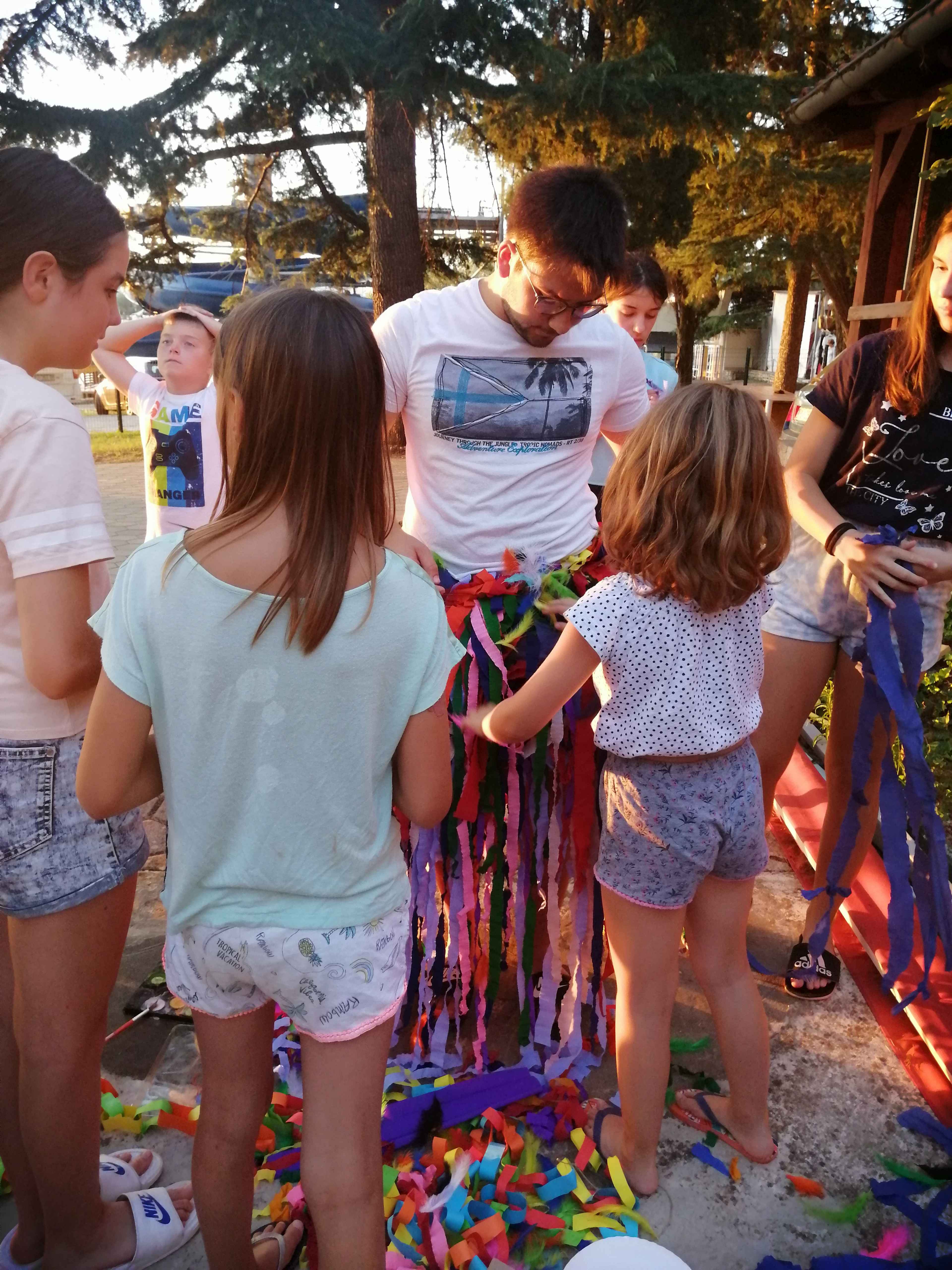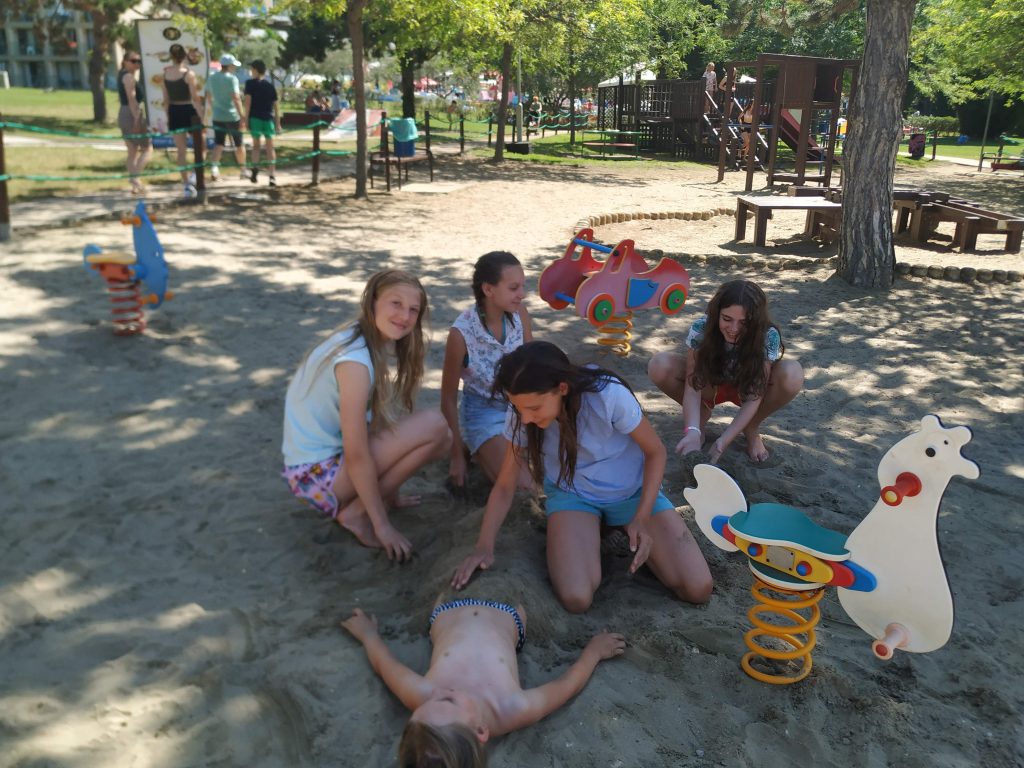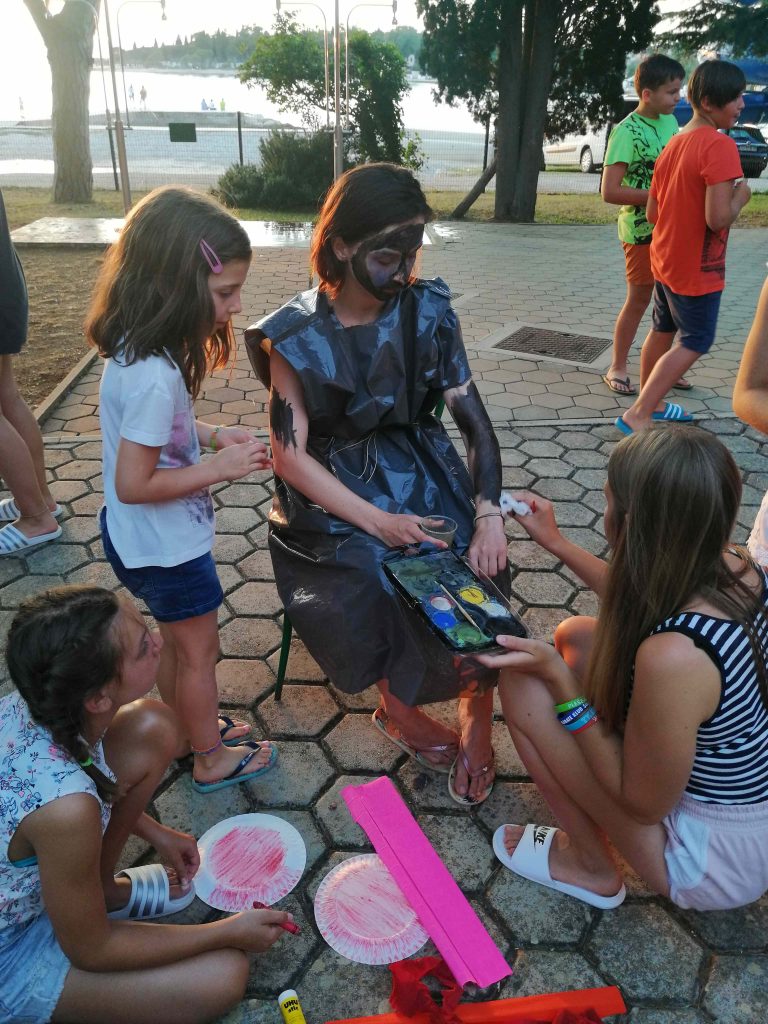 Vsi smo že komaj čakali, da se popoldne odpravimo na plažo. Mlajši otroci so bili na mivkasti plaži blizu doma, starejši otroci pa so se odpravili na Materado kjer so igrali odbojko in telovadili v fitnesu na prostem. Po večerji smo se odpravili do bližnjega travnika kjer so potekale zabavne štafetne igre. Za piko na i pa so otroci vzgojitelje oblečene odpeljali v morje ?