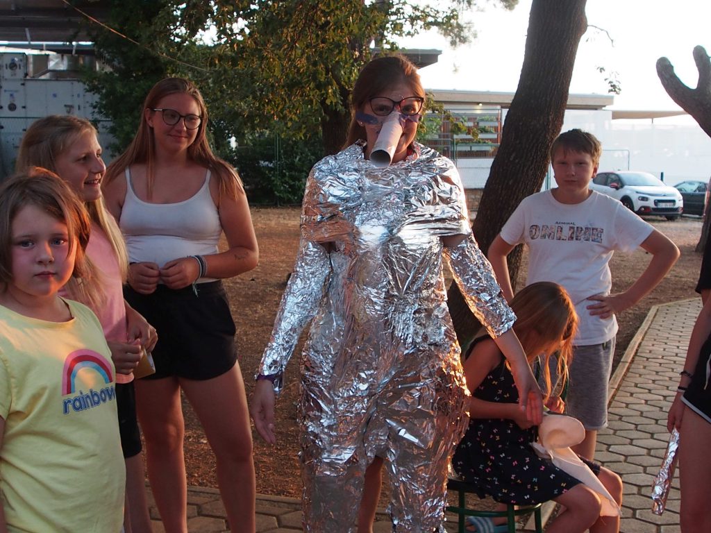 Na popoldanskih delavnicah smo izdelovali daljnoglede, se učili kickboks in se urili v spretnostih z diaboli in kitajskimi krožniki. Zvečer je sledila prava safari pustolovščina. Otroci so morali vzgojitelje našemiti v različne živali, ki jih srečamo na safariju in safari pustolovščina se je začela …