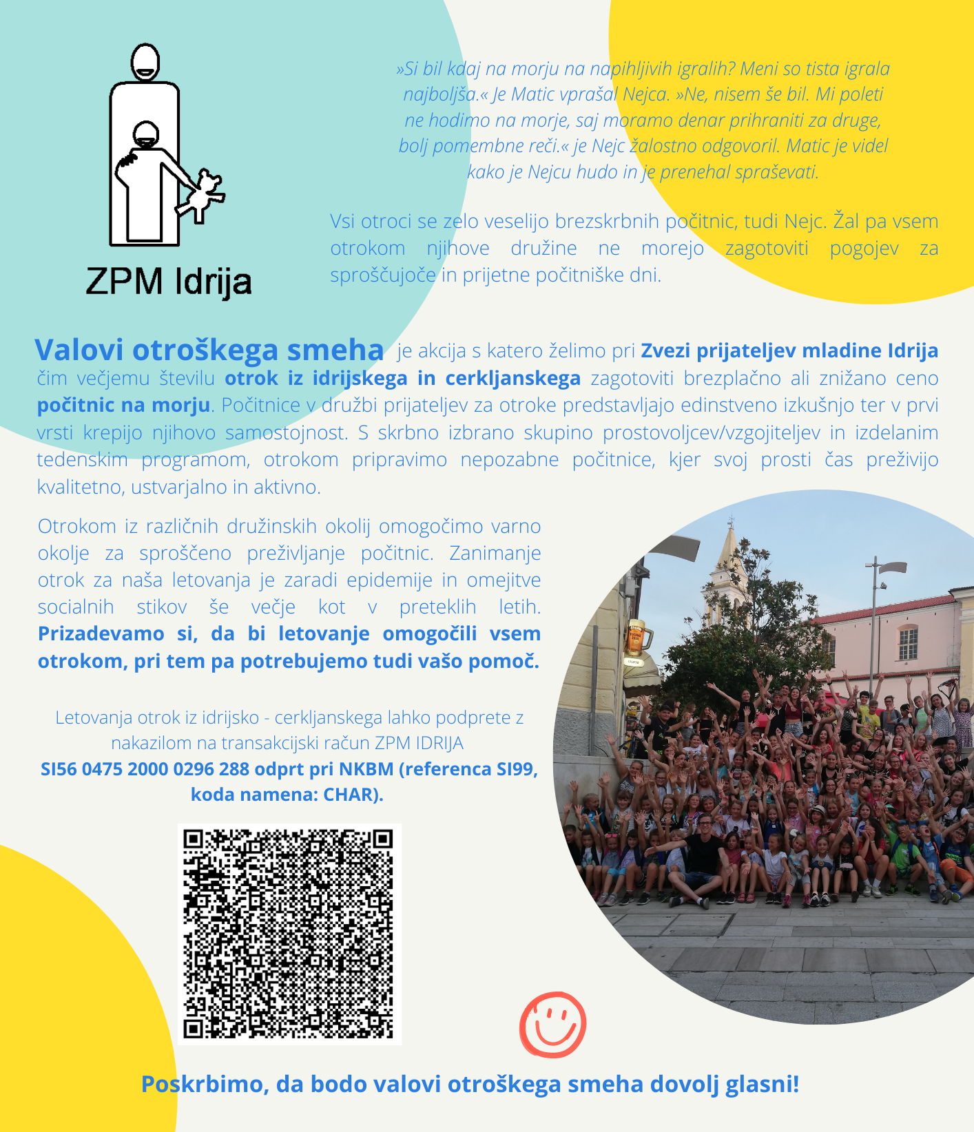 Z današnjim dnem pričenjamo veliko humanitarno akcijo, s katero želimo čim večjemu številu otrok iz idrijskega in cerkljanskega zagotoviti brezplačno ali znižano ceno letovanja na morju.